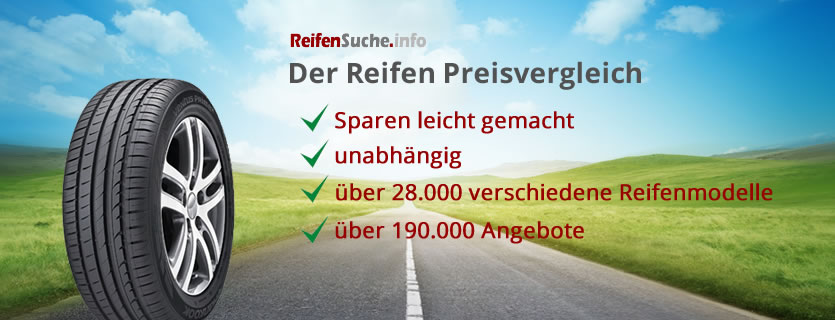 Suchmaschine und Reifen Preisvergleich für PKW-Reifen und Motorradreifen. Bei Reifensuche wird das Reifenangebot von 10 verschiedenen Online-Reifenhändlern gelistet. Geben Sie die von Ihnen gesuchte Reifengröße in die obere Suchmaske ein, oder verwenden Sie die Direktlinks, um sich die Reifen anzeigen zu lassen.